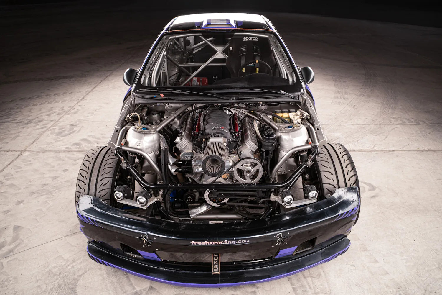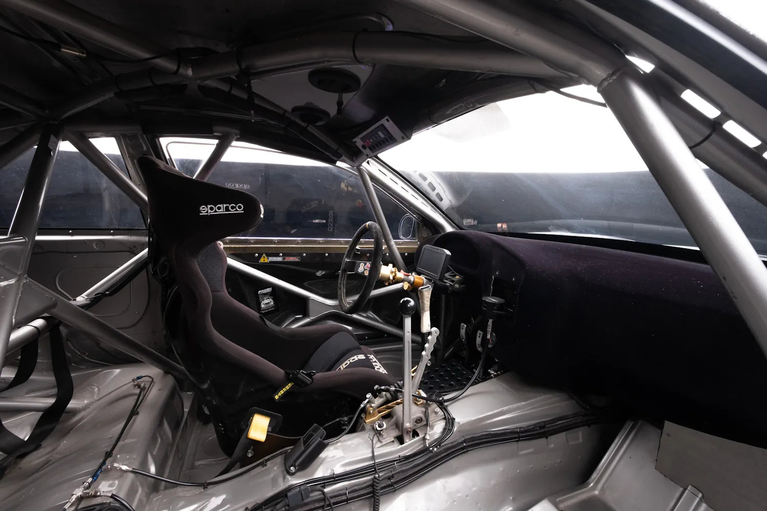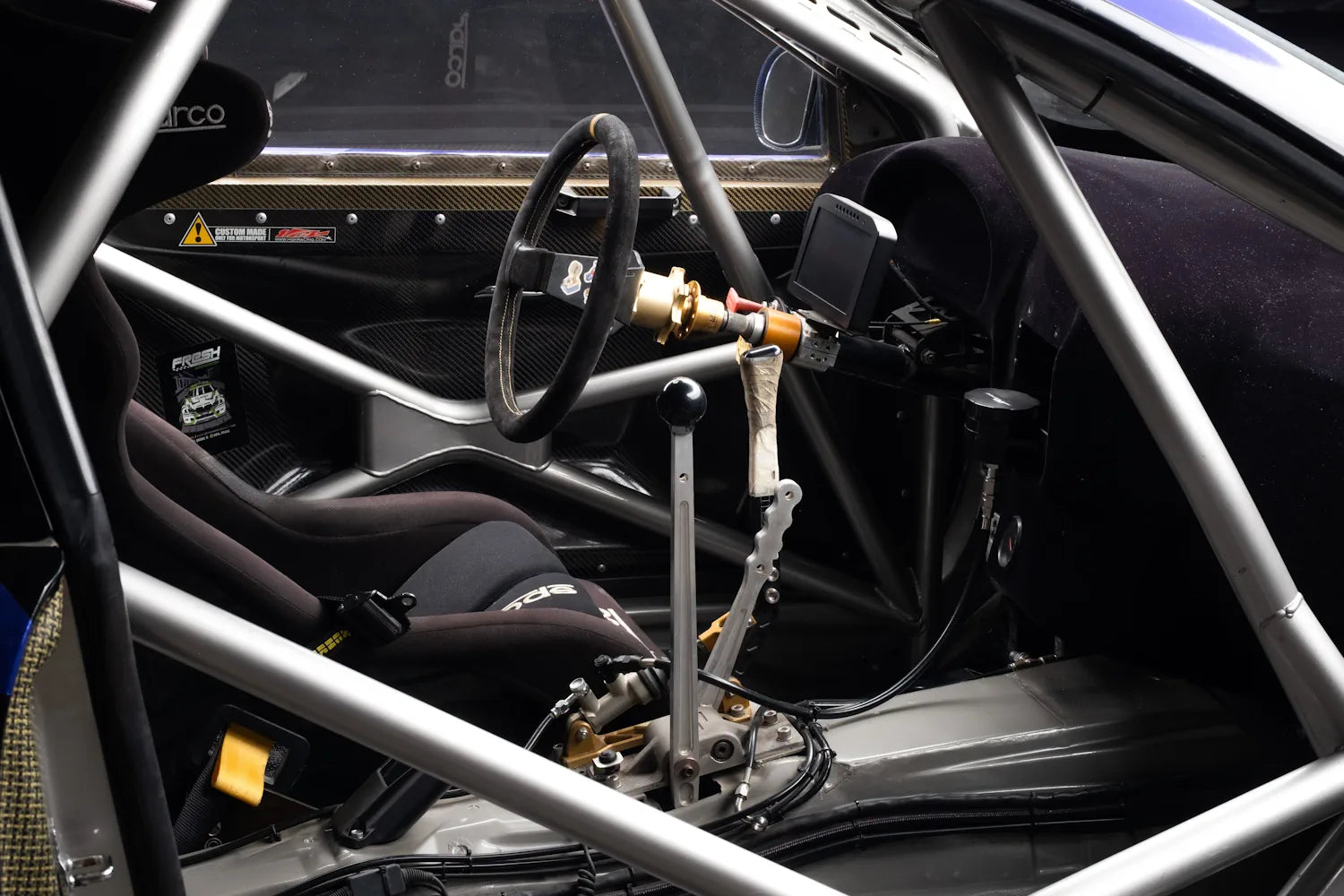 HGK roll cage and carbon-Kevlar body kit, reinforced rear subframe by Fresh Racing, Sparco seat and harness, OMP fire suppression. Full Wisefab suspension geometry, BC Racing coilovers, Wilwood brakes.