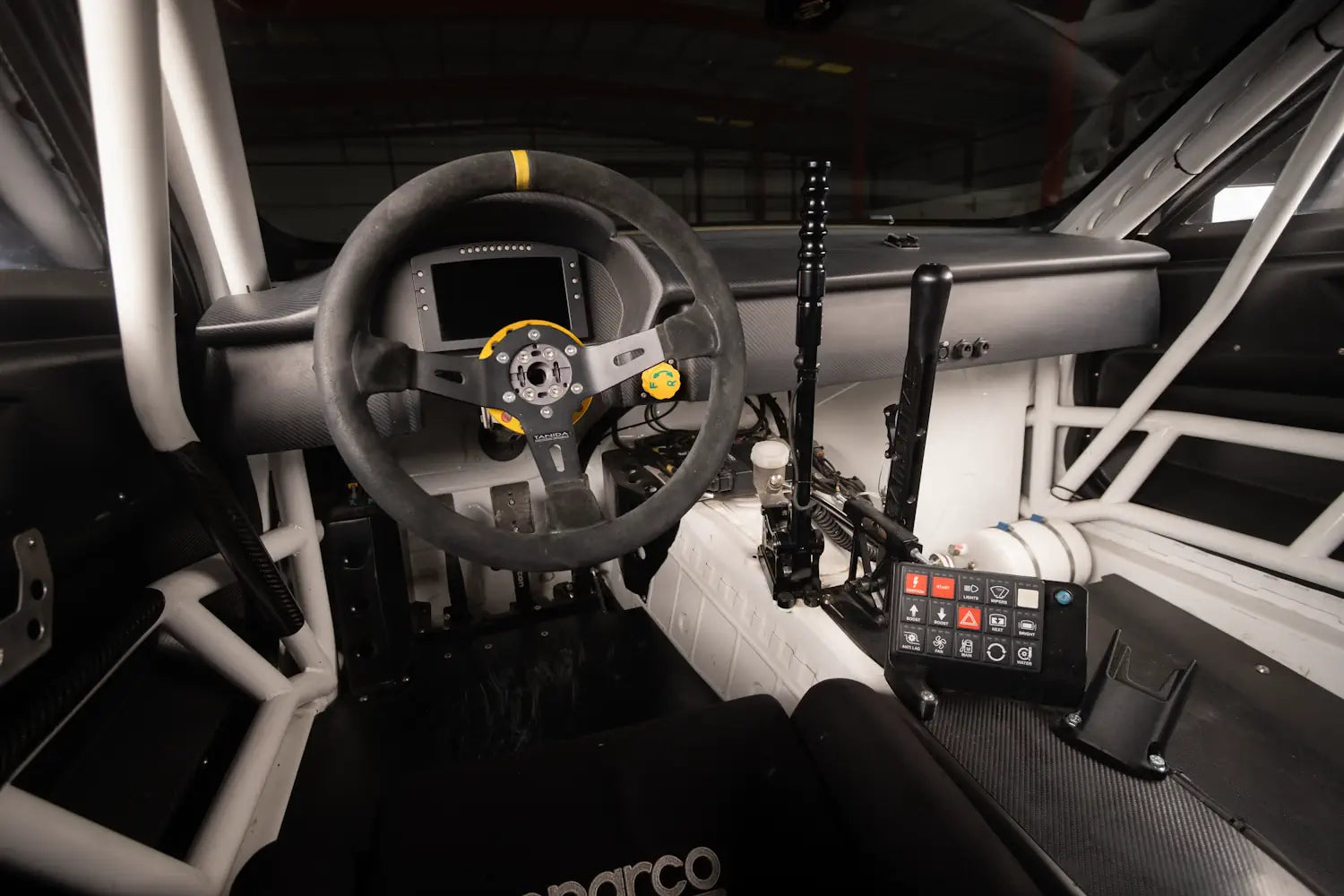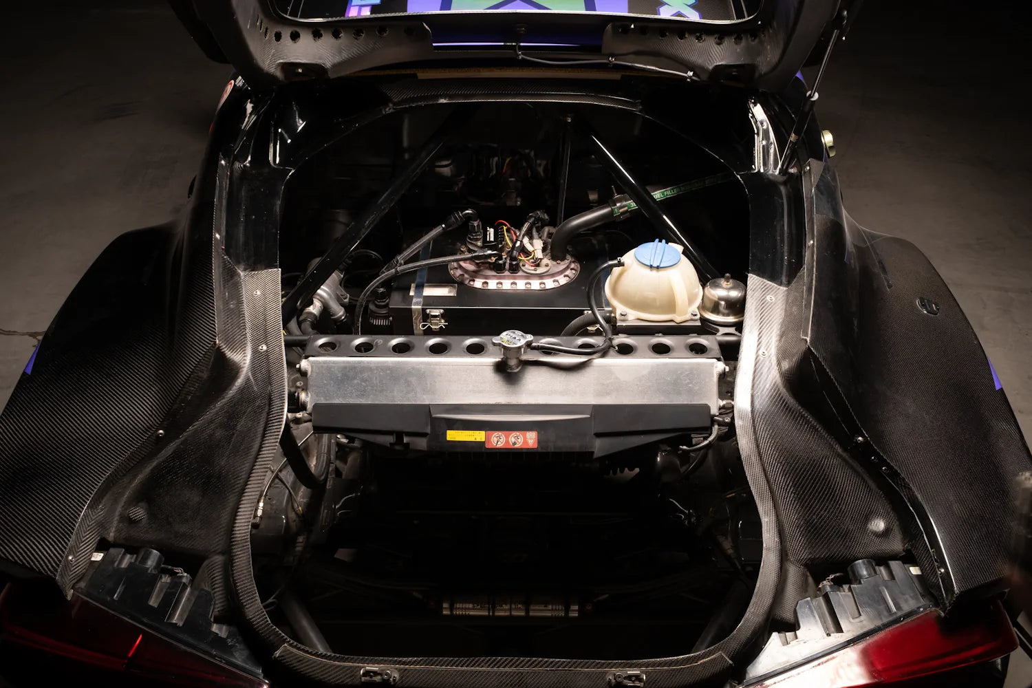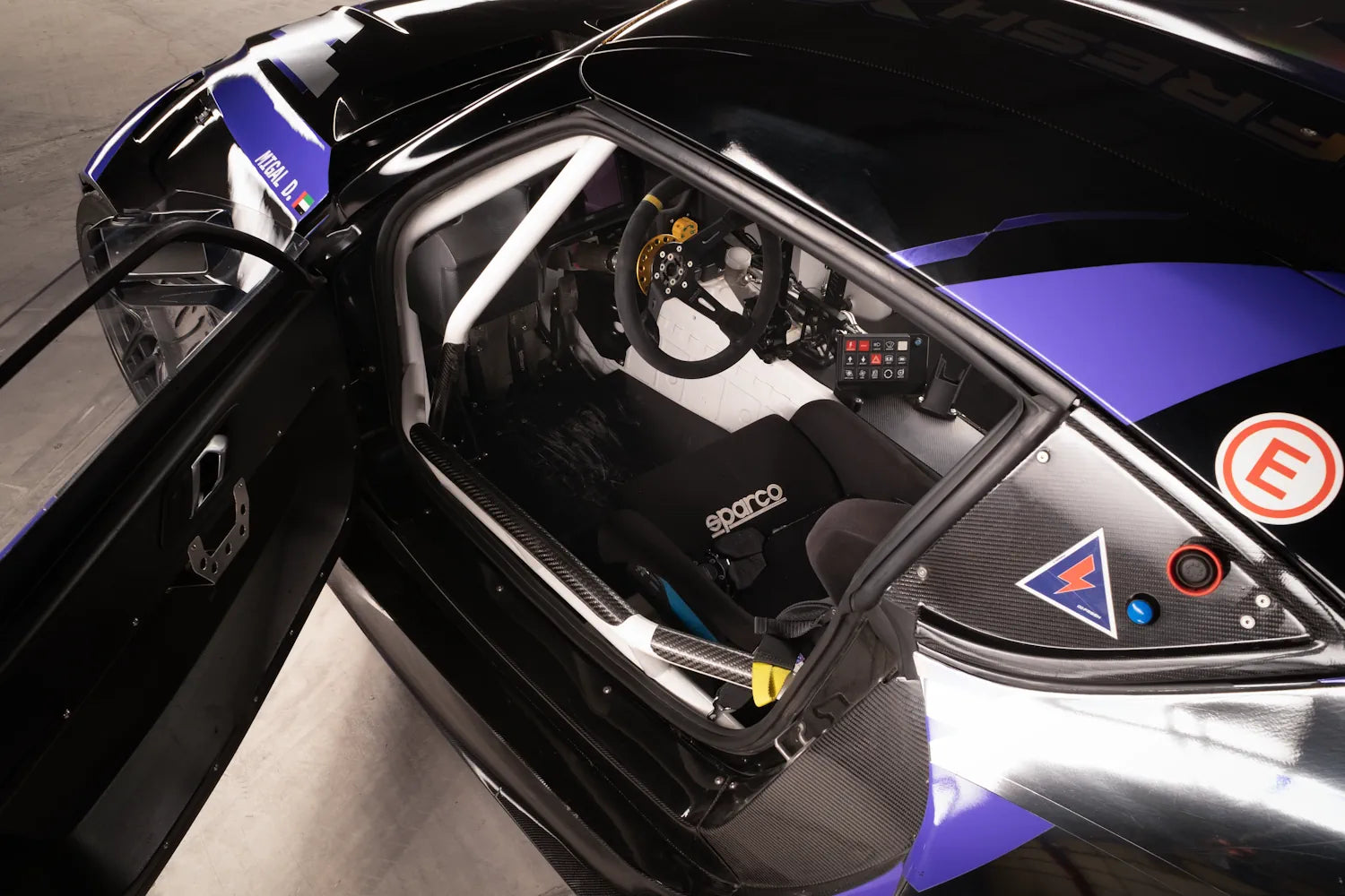 FIA-spec 8-point roll cage by RS-Customs, FIA-approved fire suppression, racing seat and harness. Reinforced subframe for quick-change diff access. Full Wisefab steering and suspension geometry, Spectrum adjustable coilovers, Wilwood braking system.