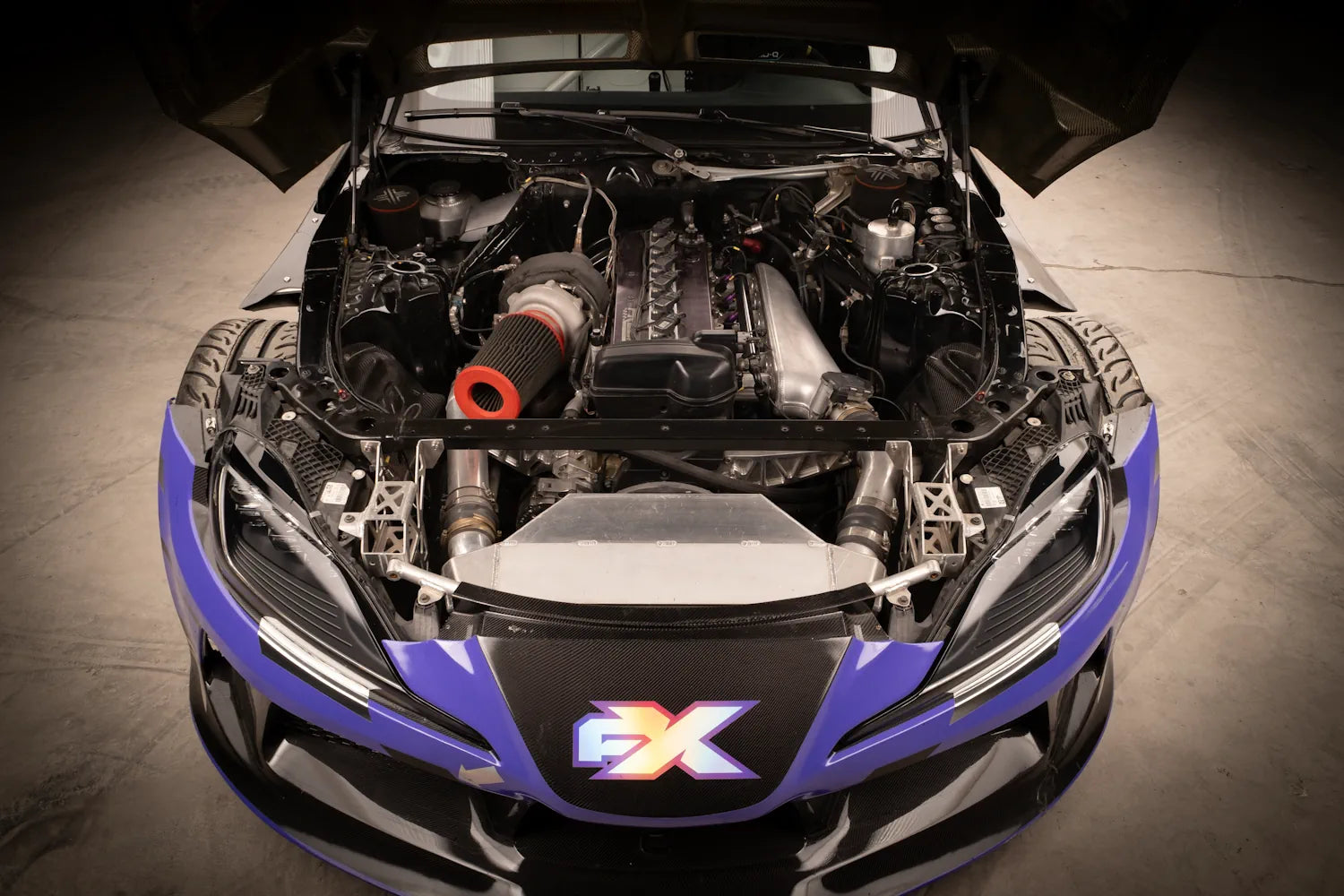 At the core is a billet 2JZ — a block machined from a solid piece of aluminum. Lighter, stronger, and built to survive what stock castings cannot. Displaced to 3.4L, paired with a Garrett turbo, running on ethanol — 950 hp, 1,000 Nm, 8,500 RPM. This is not a motor you hope will hold together. It's one you trust.